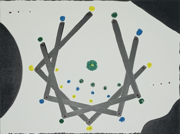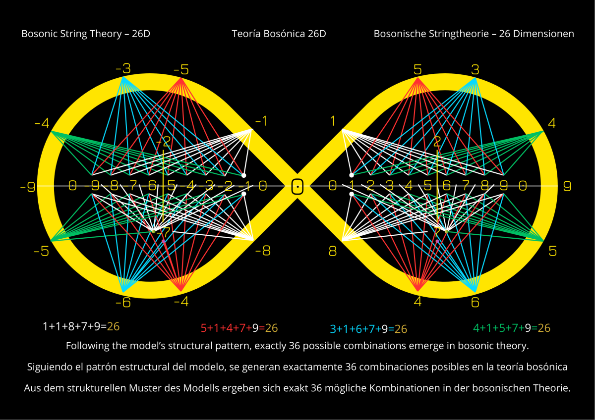 This work interprets bosonic string theory through a visual structure where the infinity symbol acts as a vibrational field. The 26 dimensions manifest in numerical combinations, symmetries, and trajectories that evoke the modes of a moving string. The result is a bridge between mathematics, physics, and art: an aesthetic cartography of the universe in vibration.